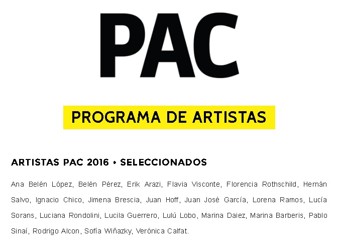 Participando del programa de artistas PAC. Proyecto PAC es un espacio de formación para artistas que buscan enriquecer, en el diálogo con agentes diversos y expertos, su propia práctica a través de un programa anual de encuentros de análisis, crítica y producción de arte. Los decentes a cargo de los diversos talleres son: Ana Gallardo, Andrés Waissman, Daniela Gutiérrez, Eduardo Stupía, Josefina Zuain, Rafael Cippolini, Rodrigo Alonso, Santiago Bengolea, Sebastián Vidal Mackinson, Silvia Gurfein y Verónica Gómez.